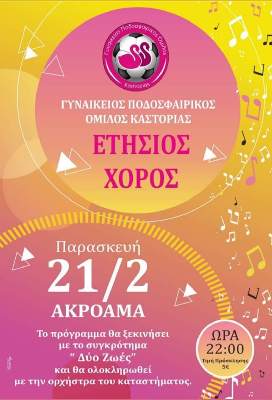 Σήμερα (Παρασκευή) θα πραγματοποιηθεί ο Ετήσιος Χορός του Γυναικείου Ποδοσφαιρικού Ομίλου Καστοριάς στο Κέντρο Διασκέδασης "ΑΚΡΟΑΜΑ".