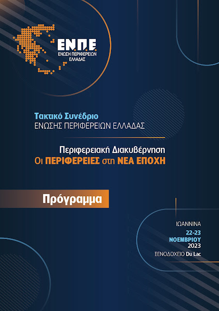 και την Πέμπτη 23 Νοεμβρίου 2023 το 9ο Τακτικό Συνέδριο της Ένωσης Περιφερειών Ελλάδας, υπό την προεδρία του Περιφερειάρχη Ηπείρου Αλέξανδρου Καχριμάνη και με κεντρικό εισηγητή τον Πρόεδρο της ΕΝΠΕ, Περιφερειάρχη Κεντρικής Μακεδονίας, Απόστολο Τζιτζικώστα.Στο συνέδριο θα εκπροσωπήσουν την Κυβέρνηση η Υπουργός Εσωτερικών Νίκη Κεραμέως, ο Αναπληρωτής Υπουργός Εσωτερικών Θοδωρής Λιβάνιος, ο Αναπληρωτής Υπουργός Εθνικής Οικονομίας Νίκος Παπαθανάσης και Γενικοί Γραμματείς, ενώ εκπροσώπηση θα έχουν η Βουλή, τα κοινοβουλευτικά κόμματα και η Κεντρική Ένωση Δήμων Ελλάδας.